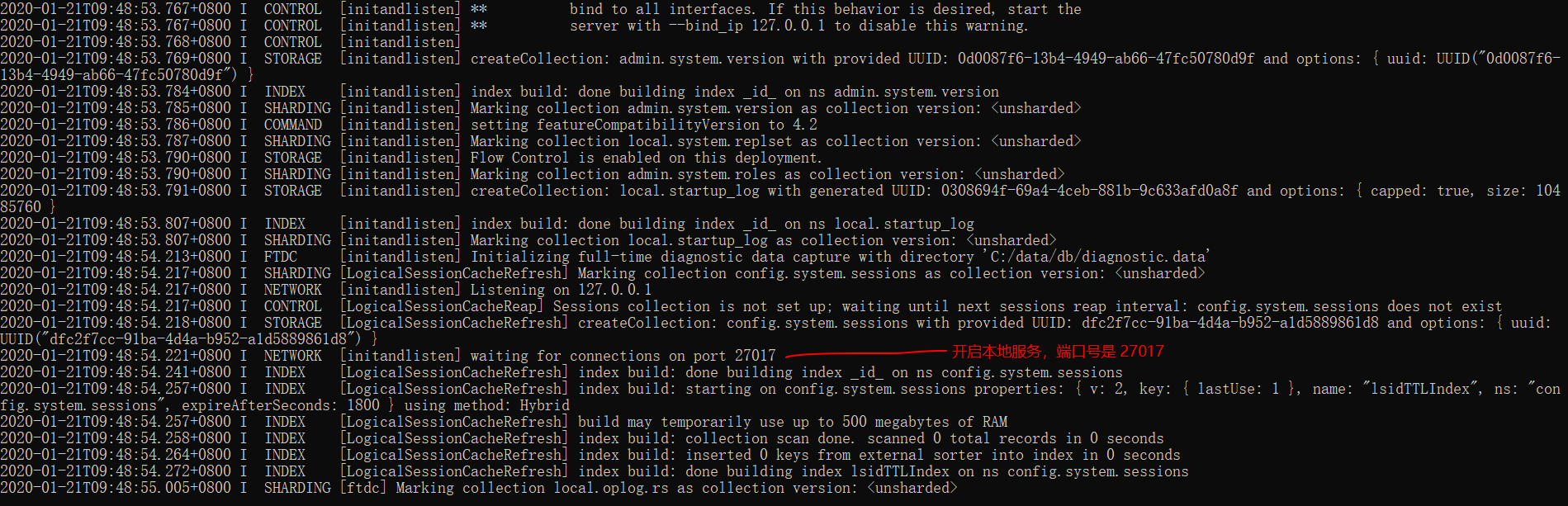 • 打开 cmd ,输入 mongod 启动 mongodb 服务器。如果出现下面的回显,表明开启服务成功。
