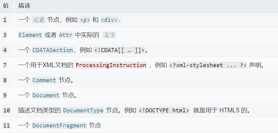 上面代码中 in 运算符在 IE8 及其以上版本是支持的,可以使用,node.nextSibling 和 node.nodeType 属性在 IE8 上也是支持的,前者表示获取一个结点(是结点,而非元素结点)的下一个兄弟结点(而不一定是元素结点);后者是指获取一个结点的结点类型,当 nodeType === 1时,表示该结点是一个元素结点。不同的结点它的结点类型也不相同: